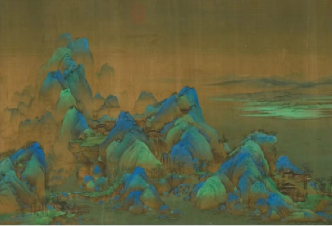 《千里江山圖》畫卷構(gòu)圖周密,色彩絢麗,用筆精細,畫面著意刻劃的自然景色,既概括地表現(xiàn)了山勢綿亙、水天一色的浩森氣象,又精心地勾畫了幽巖邃谷、高峰平坡、流溪飛泉、波濤煙靄等自然界變幻無窮的狀態(tài),使千里江山既開闊無垠,又曲折入微,充分地顯示了祖國山河的壯麗多姿。
