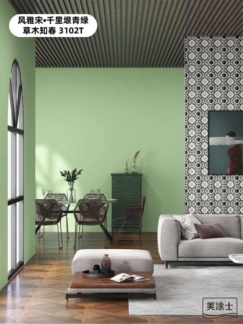 美涂士國潮色草木知春3102T,弱化了復(fù)古綠的陳舊感,強(qiáng)化了空間的時(shí)髦感,與灰白軟裝的搭配,一明一暗的對比,一冷一暖的融合,奢華的質(zhì)感與復(fù)古的氣息碰撞,勾勒出低調(diào)的高級(jí)時(shí)尚感,讓空間的氣場和顏值達(dá)到峰值。