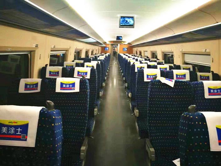 不僅僅只是在高鐵車廂的座椅頭枕上,在京廣深段高鐵沿線主要城市,美涂士亦投放了高鐵站內(nèi)LED大屏廣告與站臺(tái)動(dòng)態(tài)燈箱廣告。除此之外,美涂士還斥重金在京廣深路線列車以及滬漢蓉線《火車》雜志上打造美涂士品牌形象;覆蓋廣東、湖南、湖北、河南、河北、北京、遼寧、福建、黑龍江等多個(gè)省份城市運(yùn)行區(qū)間的高鐵列車,將美涂士崇尚健康安心的生活方式和打造環(huán)保涂料的理念傳達(dá)給數(shù)以億計(jì)的乘客,共同見證美涂士雄厚的品牌實(shí)力。