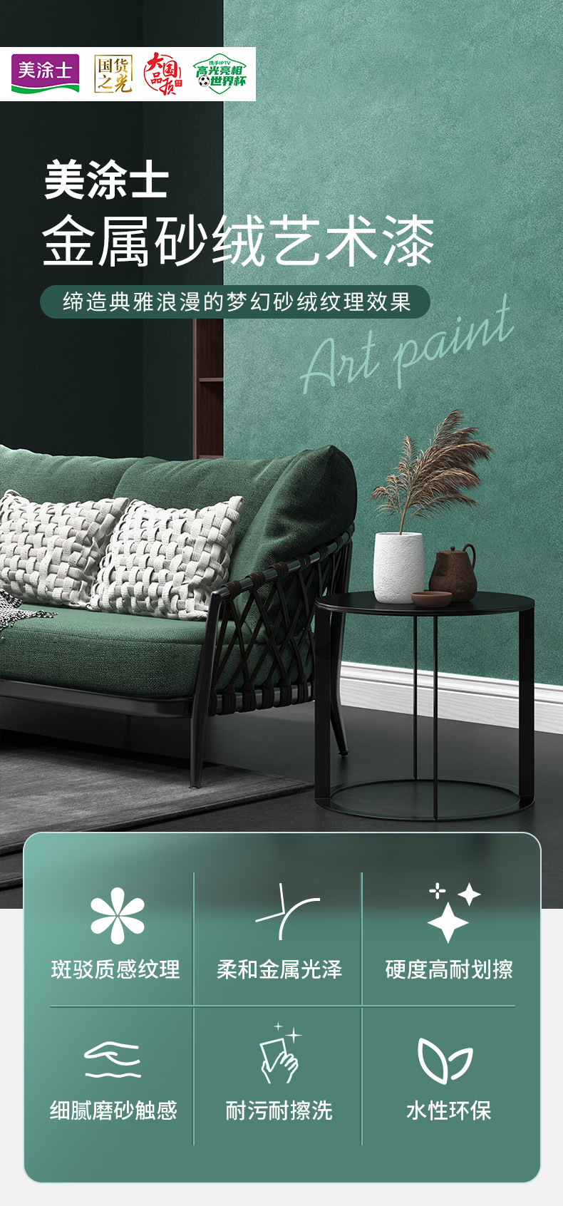 美涂士藝術(shù)漆,帶有金屬光澤和磨砂觸感效果,是砂與絨的完美質(zhì)感結(jié)合,紋理有序而又幻變,效果細(xì)膩而又典雅,打造出大氣與精致兼?zhèn)涞母呒壐裾{(diào)!
